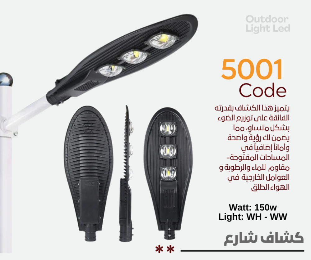 شركة الشمال للإنارة تقدم هذا الكشاف بتصميم مميز وكفاءة عالية في استهلاك الطاقة، مع ضمان لمدة سنتين لضمان رضا العملاء واستمرارية الأداء العالي. الكشاف متوفر بألوان مقاومة للعوامل البيئية القاسية مما يجعله مثاليًا للاستخدام الخارجي.